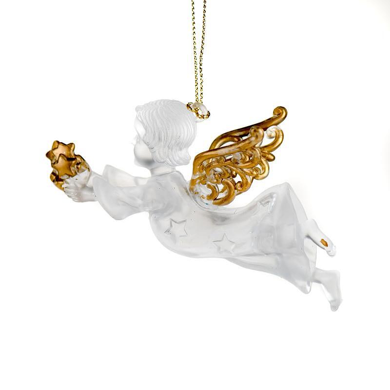 Ангелочек держит в руках маленькие золотые звёздочки, которые добавляют сверкающий акцент и усиливают праздничную атмосферу. Он лёгкий, воздушный и чудесно отражает свет ёлочных огней, создавая мягкое свечение. Он подойдёт как в качестве основного украшения для ёлки, так и в качестве детали более крупных рождественских композиций.