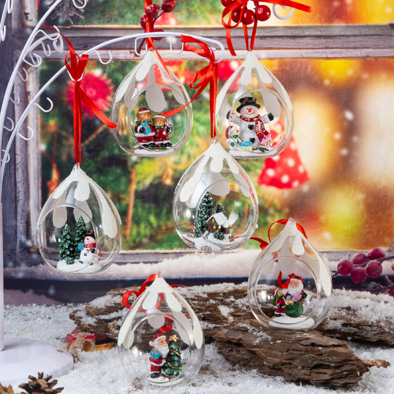 - Дизайн: Каплевидные украшения с белым «снежным» декором по верхнему краю; на каждом шаре изображена отдельная фигурка — Санта-Клаус, снеговик, домик или плюшевый мишка.
