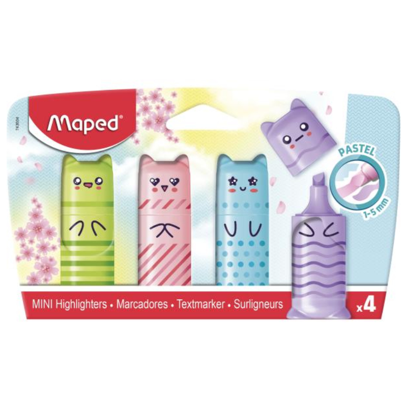 Набор из 4 мини-маркеров Maped Fluo Peps Mini Friends пастельных тонов, компактного размера и с забавным детским дизайном. Подходят для школы, выполнения домашних заданий и творческих занятий, их удобно носить в пенале и легко использовать малышам.