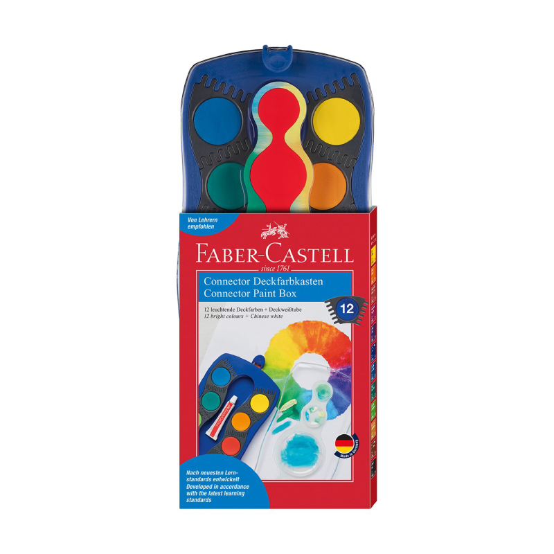 Набор акварельных красок Faber-Castell Connector из 12 цветов (синяя основа) отличается инновационным дизайном, превращающим рисование в игру. Каждый цвет находится в отдельной съемной коробке, которую можно использовать как по отдельности, так и соединять с другими, создавая различные комбинации и формы — как в настоящем акварельном конструкторе. Это делает продукт подходящим для детей, которые изучают цвета и их смешивание в игровой форме, а также облегчает организацию и переноску красок.