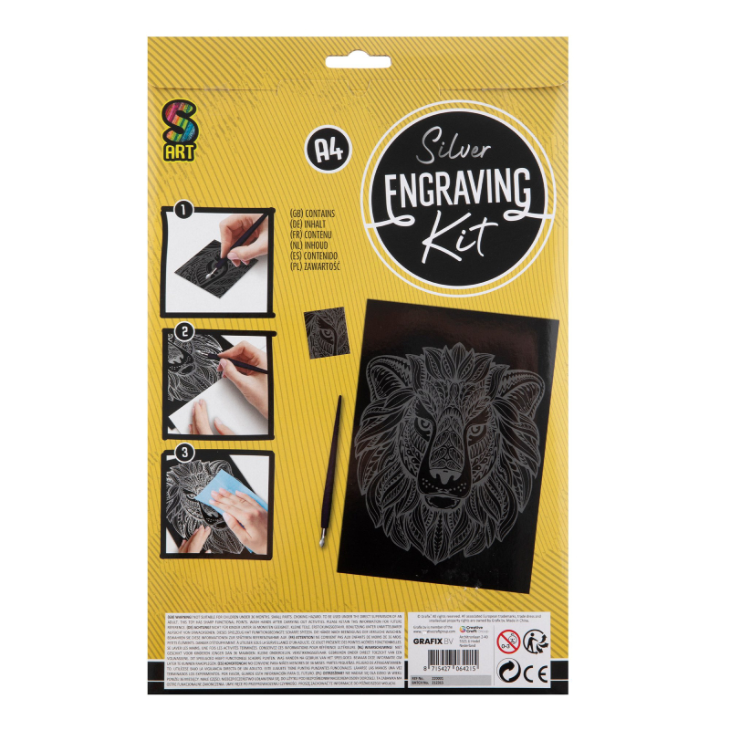 В набор входит стираемое изображение красочного льва с декоративными орнаментами формата А4, а также инструмент для стирания, который постепенно раскрывает яркие цвета под поверхностью. Занятие развивает воображение, мелкую моторику и концентрацию.