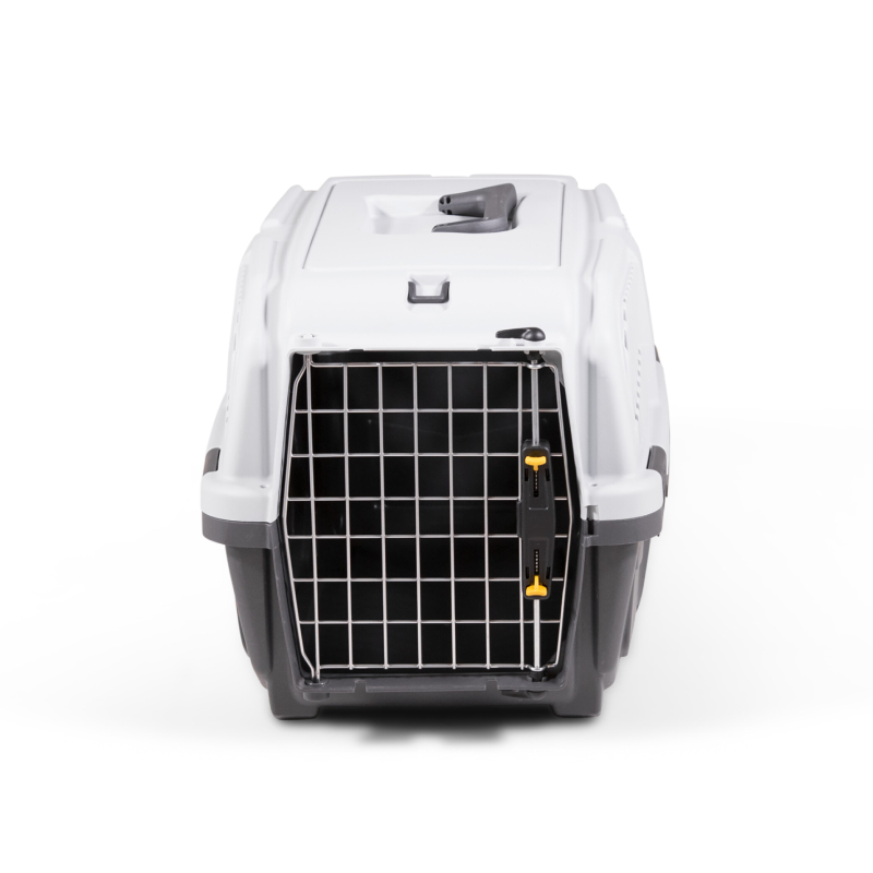 Клетка изготовлена из прочного пластика и металла, что гарантирует устойчивость и безопасность. Она подходит как для автомобильной, так и для воздушной транспортировки в соответствии с требованиями к перевозке животных.