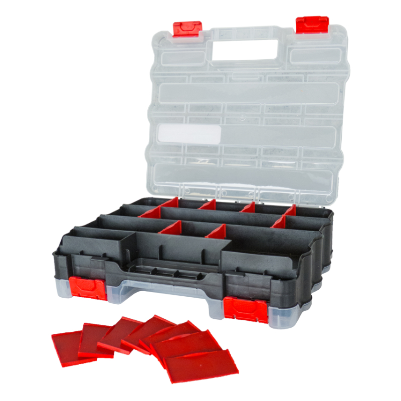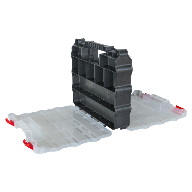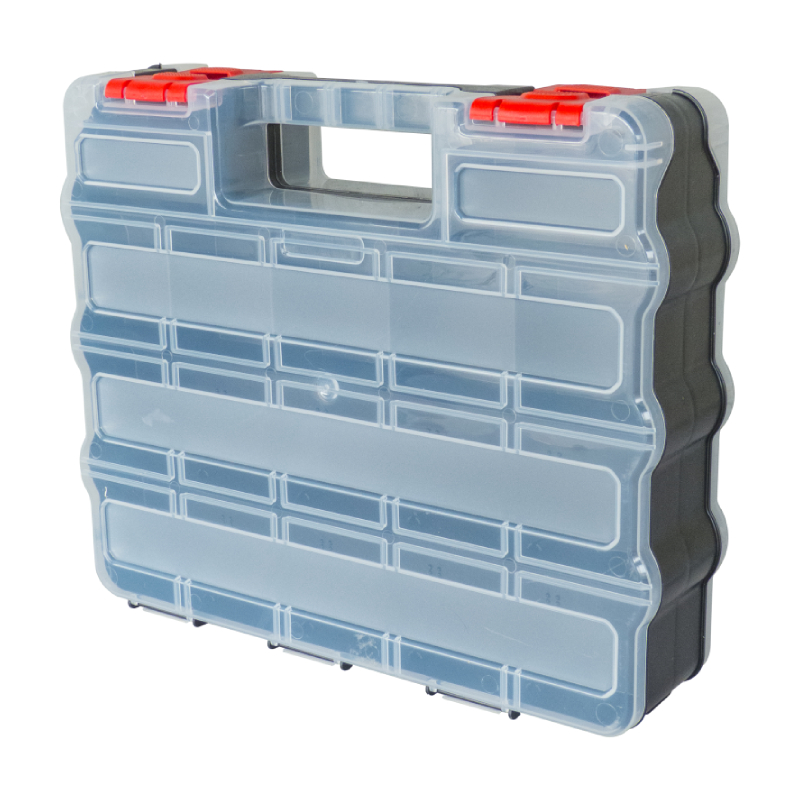 Двусторонняя конструкция органайзера обеспечивает повышенную вместимость и легкую организацию, обеспечивая быстрый доступ к необходимым предметам. Оснащенный прочной и удобной для захвата ручкой, он практичен для переноски, что делает его идеальным помощником как на рабочем месте, так и для мобильного использования. Сочетание цветов черного, прозрачного и красного дополнительно помогает быстро идентифицировать содержимое и поддерживать порядок.