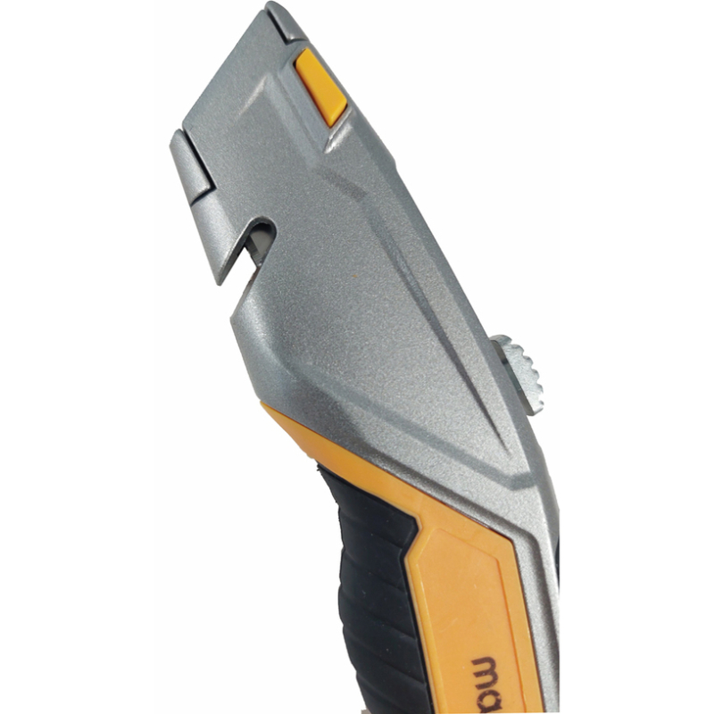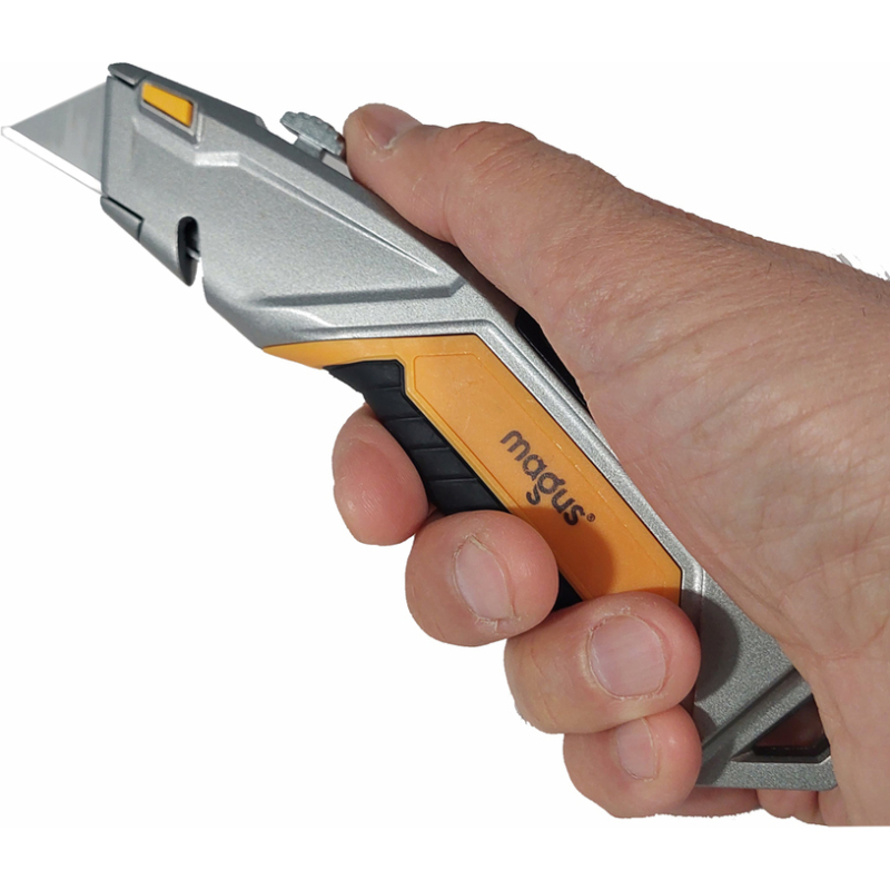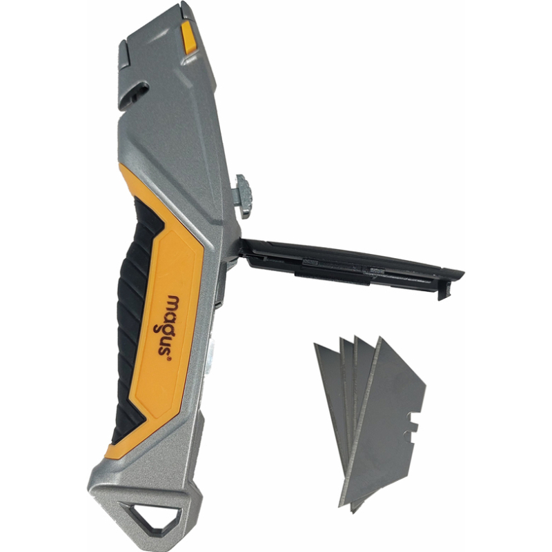 Нож модели MAGUS с ломающимся лезвием, прочной цинковой рукояткой и эргономичным дизайном.