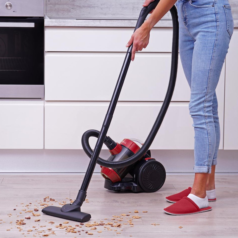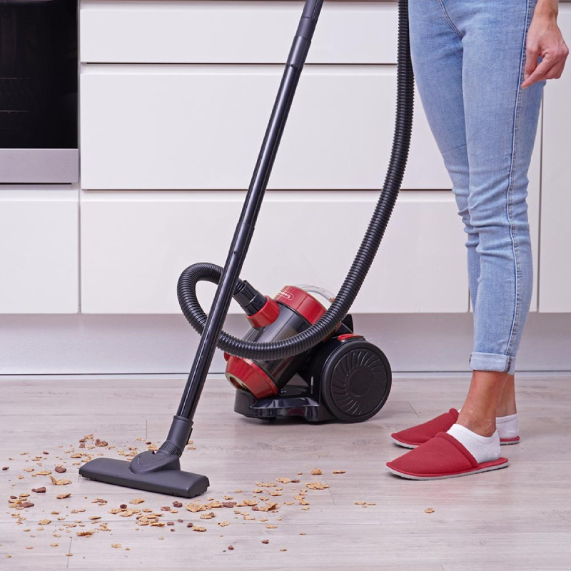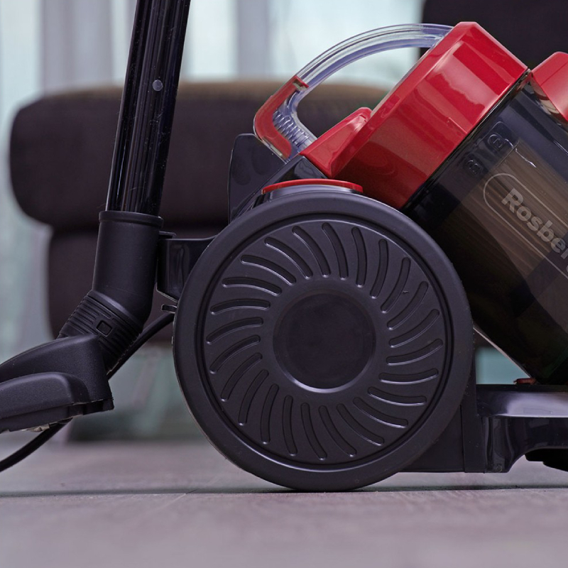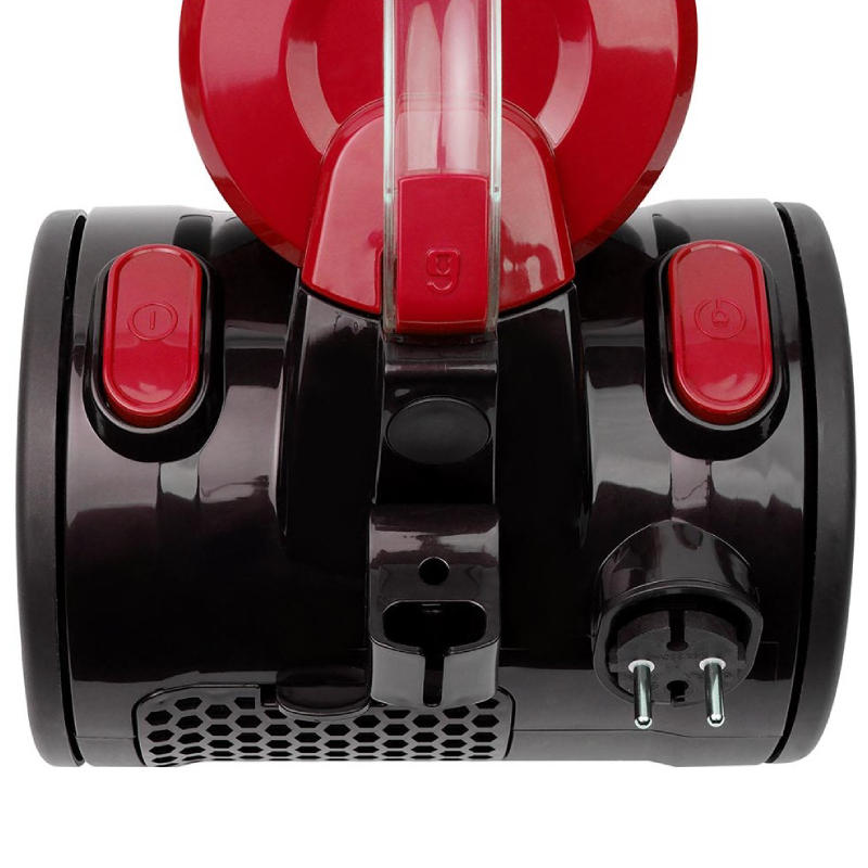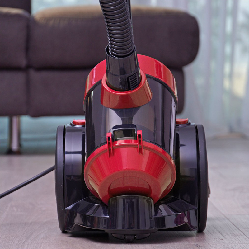 Пылесос удобно переносить и маневрировать благодаря большим колёсам и эргономичной ручке. Его функциональность дополняется автоматическим сматыванием кабеля и возможностью использования различных насадок, в том числе для узких пространств, что делает его подходящим для уборки любых напольных покрытий. Простота обслуживания, современный дизайн в красном цвете и современный энергосберегающий двигатель делают его практичным и надежным помощником в каждом доме.