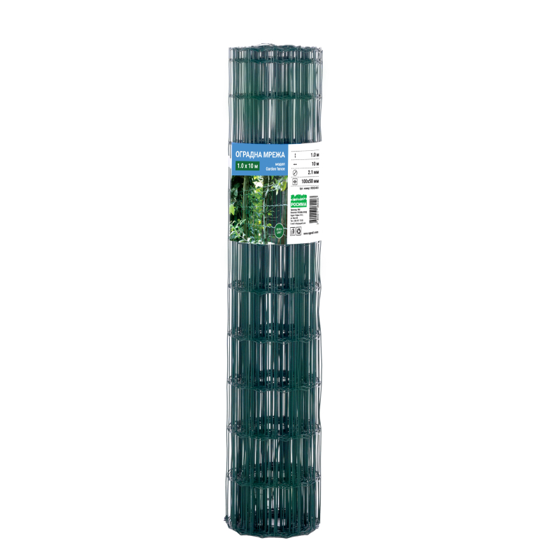 Сетка изготовлена из стальной проволоки диаметром ⌀2,1 мм, оцинкована и покрыта слоем зеленого ПВХ, что делает ее устойчивой к атмосферным воздействиям и коррозии. Прямоугольная форма отверстий размером 100 x 75 мм обеспечивает хорошую видимость и устойчивость, а также свободное проникновение света и воздуха.