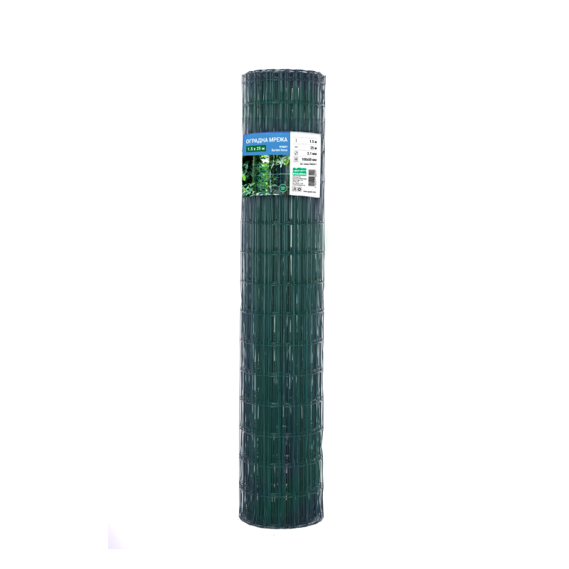Сетка изготовлена из стальной проволоки диаметром ⌀2,1 мм, оцинкована и покрыта слоем зеленого ПВХ, что делает ее устойчивой к атмосферным воздействиям и коррозии. Прямоугольная форма отверстий размером 100 x 75 мм обеспечивает хорошую видимость и устойчивость, а также свободное проникновение света и воздуха.