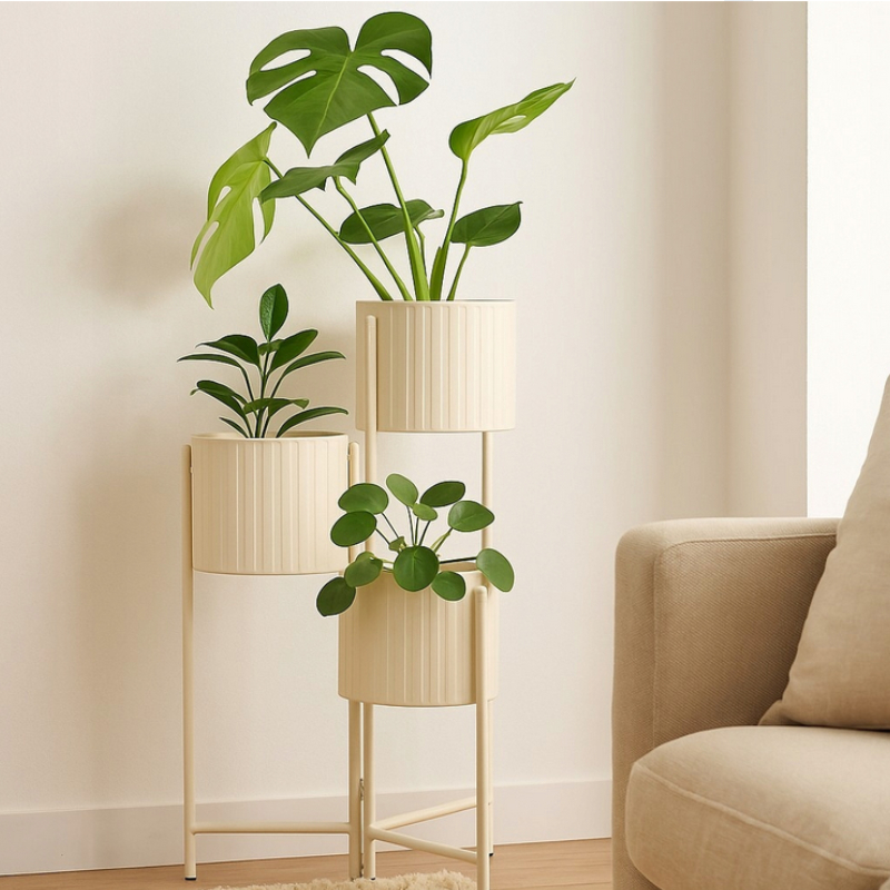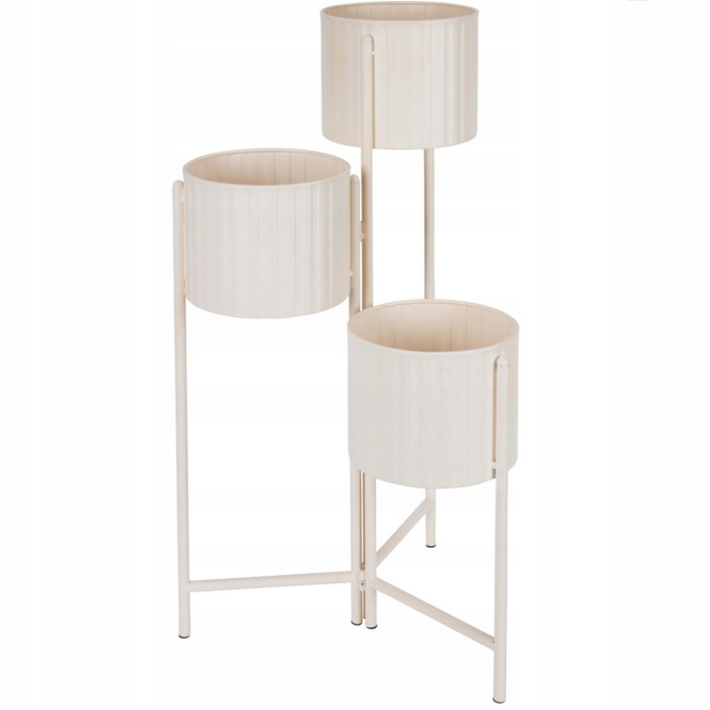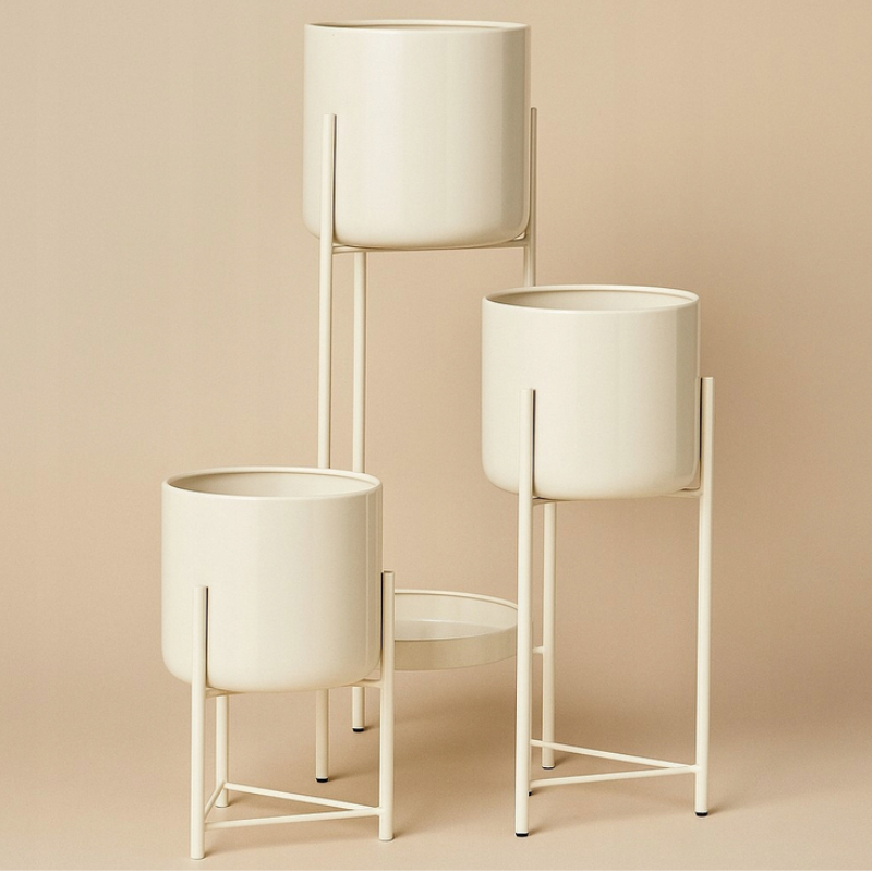 Стильный металлический кашпо в стиле лофт, рассчитанный на 3 горшка, добавит современный и элегантный акцент в интерьер или на террасу. Лаконичный дизайн и нейтральный бежевый цвет позволяют легко сочетать его с мебелью разных стилей.