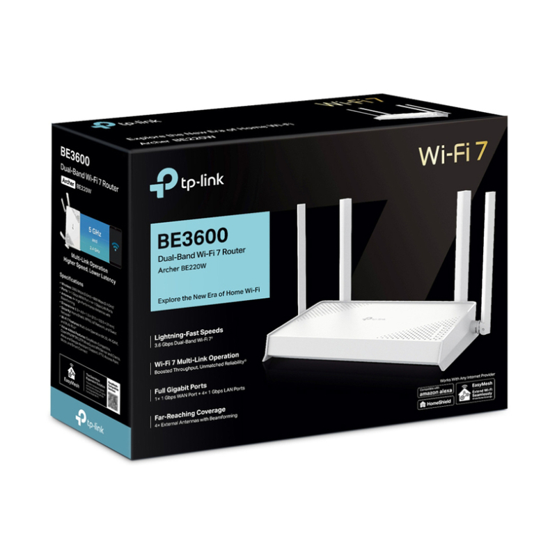 TP-Link Archer BE220W / BE3600 — это современный маршрутизатор Wi-Fi 7 следующего поколения, разработанный для создания чрезвычайно быстрой и стабильной домашней сети. Благодаря суммарной скорости до 3570 Мбит/с (до 688 Мбит/с на частоте 2,4 ГГц и до 2882 Мбит/с на частоте 5 ГГц), 4 внешним антеннам и поддержке Mesh-сети, он является отличным выбором для игр, потоковой передачи 4K/8K и домов с большим количеством подключенных устройств.