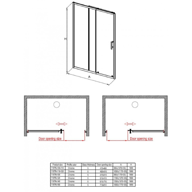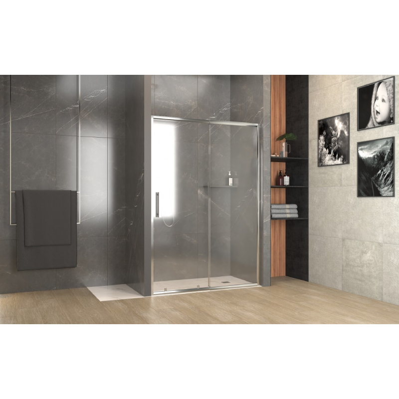 Изготовленная из закаленного прозрачного стекла толщиной 5 мм и хромированного алюминиевого профиля, эта модель гарантирует прочность и долговечность. Двойные ролики обеспечивают плавное и бесшумное движение двери, а компенсаторный профиль позволяет легко устанавливать и точно регулировать положение двери на неровных стенах. Квадратные ручки из нержавеющей стали дополняют современный внешний вид и удобство использования.