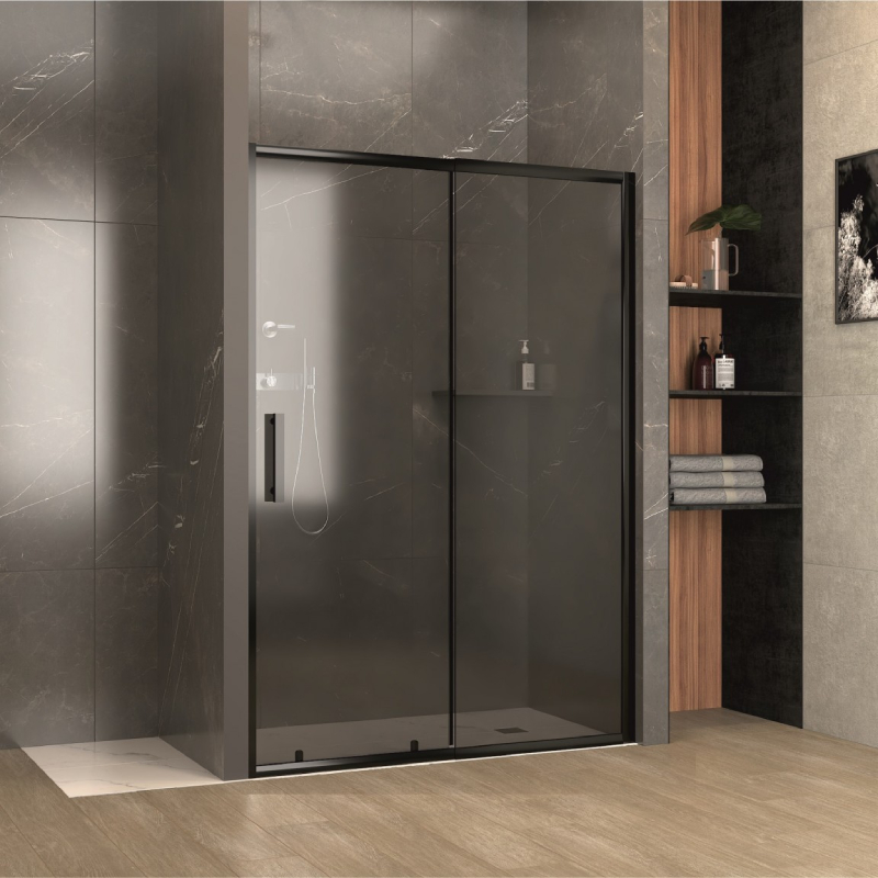 Изготовленная из закаленного тонированного стекла толщиной 5 мм и черного алюминиевого профиля, эта модель гарантирует прочность и долговечность. Двойные ролики обеспечивают плавное и бесшумное движение двери, а компенсаторный профиль позволяет легко устанавливать и точно регулировать положение двери на неровных стенах. Квадратные ручки из нержавеющей стали дополняют современный внешний вид и удобство использования.