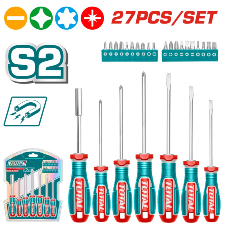 Набор TOTAL Industrial включает 27 предметов — отвертки и биты, предназначенные для сборочных, сервисных и ремонтных работ. Инструменты изготовлены из высококачественной стали S2, обеспечивающей высокую прочность, износостойкость и длительный срок службы. Намагниченные наконечники облегчают работу с винтами и обеспечивают больший контроль и удобство при сборке.