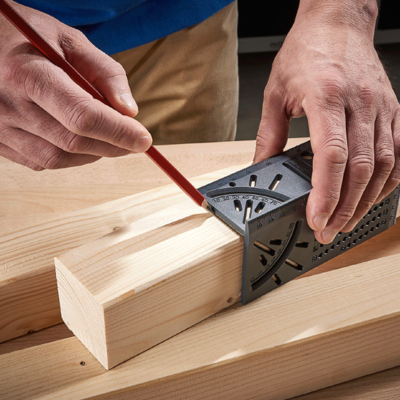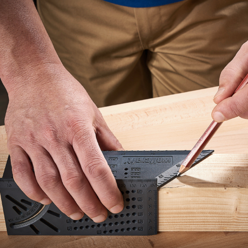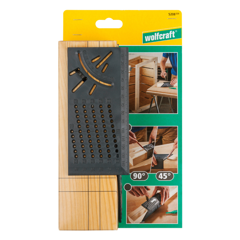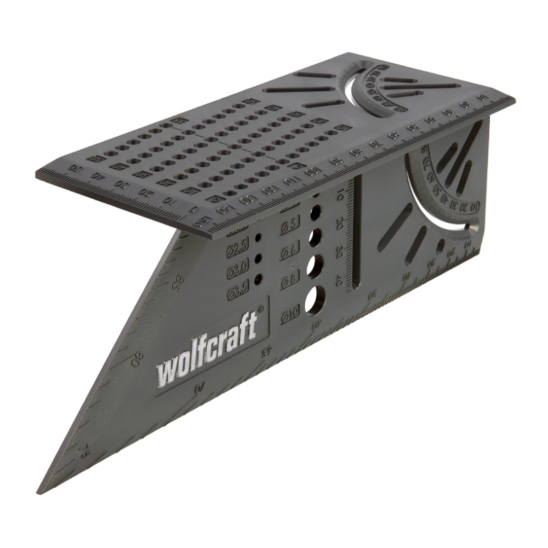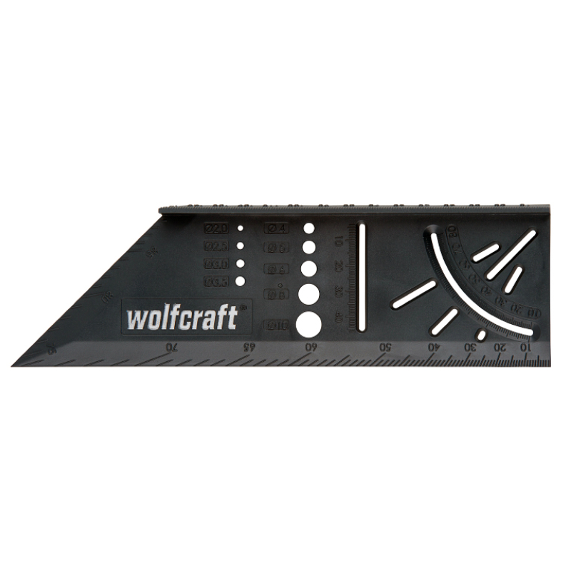 Угломерный шаблон WOLFCRAFT — это специализированный инструмент, предназначенный для точного измерения и разметки углов на трехмерных элементах, таких как балки, профили и другие конструктивные детали. Благодаря встроенному угловому упору с автоматической остановкой, он позволяет быстро и легко устанавливать стандартные углы 45° и 90°, что обеспечивает точность и удобство в работе. Дополнительная шкала углов от 0° до 90° позволяет точно измерять нестандартные углы, а также может использоваться для разметки параллельных линий на различных материалах.