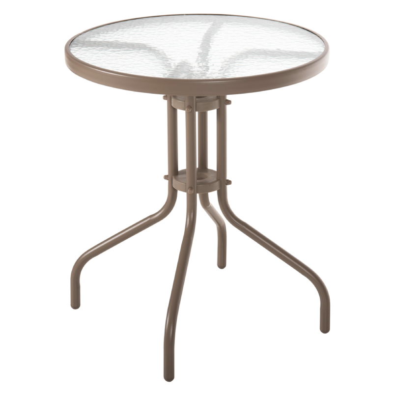 Конструкция выполнена из металла с порошковым покрытием нежного цвета шампанского, устойчивого к влаге и воздействию окружающей среды. Столешница из закаленного рельефного стекла придает классический вид и проста в уходе.