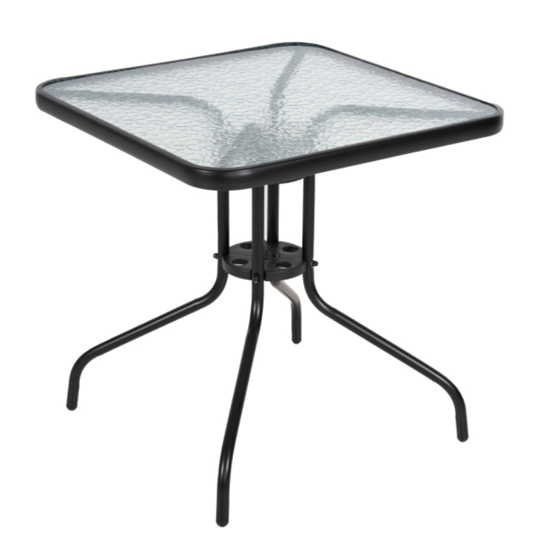 Столешница из закаленного стекла с рельефной поверхностью придает изделию легкий и современный вид, при этом она прочна и легко чистится. Прочная конструкция из черного металла обеспечивает устойчивость и долговечность даже в условиях открытого воздуха.