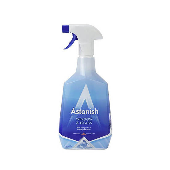 Чистящий спрей ASTONISH содержит дополнительную защиту, предохраняющую стеклянные поверхности от пота. В состав препарата также входит аммиак, гарантирующий характерный блеск обработанных стеклянных деталей, зеркал и т. д. Помимо придания чистоты и блеска, спрей также обладает приятным ароматом.
