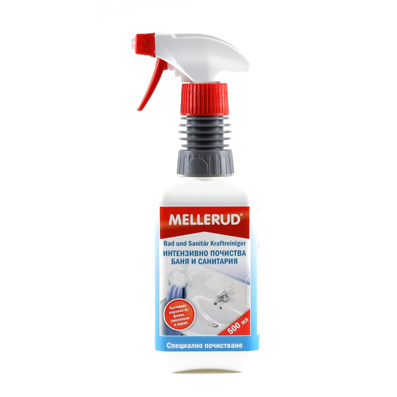 Первоклассное чистящее средство для ванной, фаянса и сантехники марки MELLERUD в форме спрея. Продукт особенно эффективен, когда необходимо удалить слои с плитки, раковин, ванн, душевых кабин, смесителей, джакузи, унитазов, биде, писсуаров и многого другого.