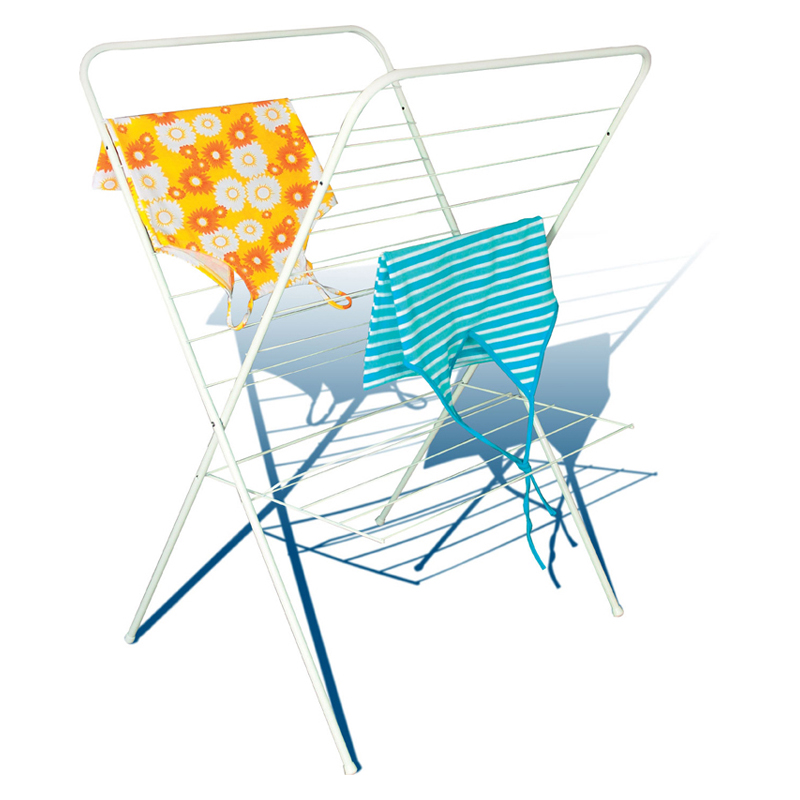 Сушилка белого цвета с порошковым покрытием. Удобный и очень компактный для тесных помещений. Подходит как для внутреннего, так и для наружного использования.