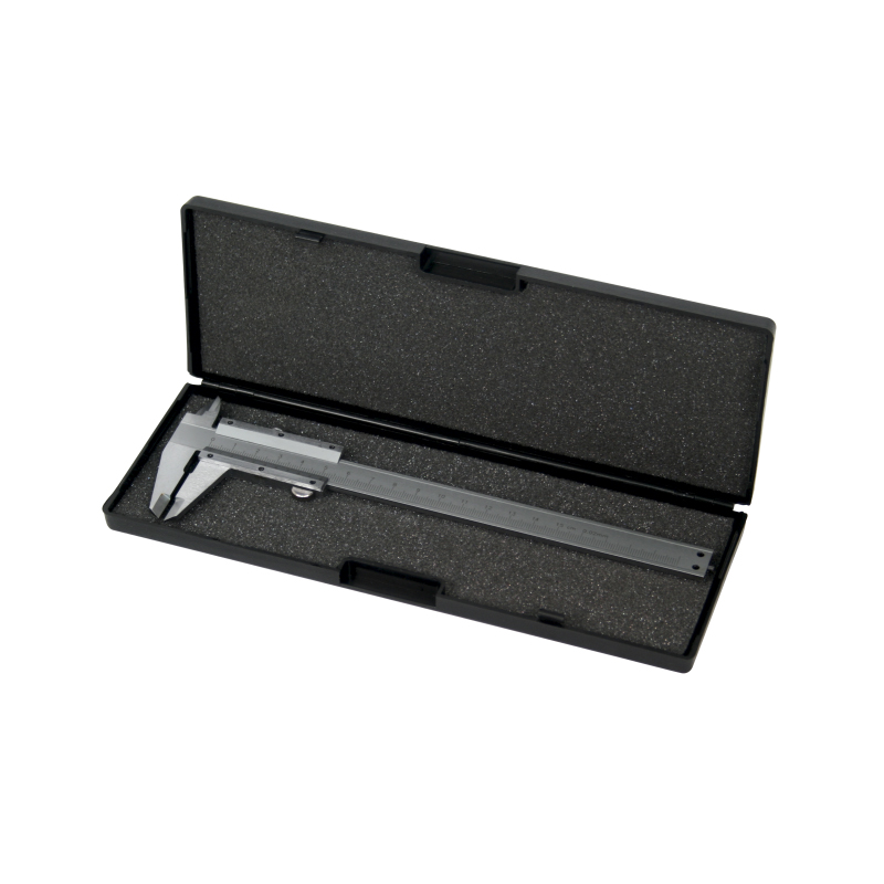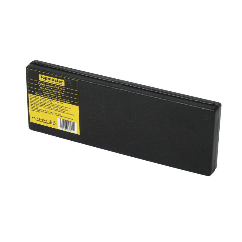 Изделие представляет собой металлический штангенциркуль TOPMASTER со шкалой от 0 до 150 мм ТМД. Корпус изготовлен из нержавеющей стали. Длина штангенциркуля 235 мм, точность ± 0,02 мм.